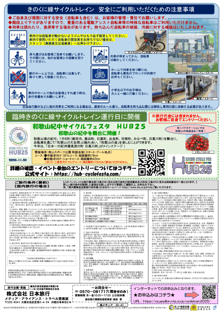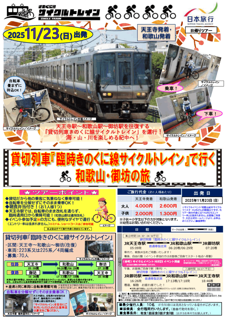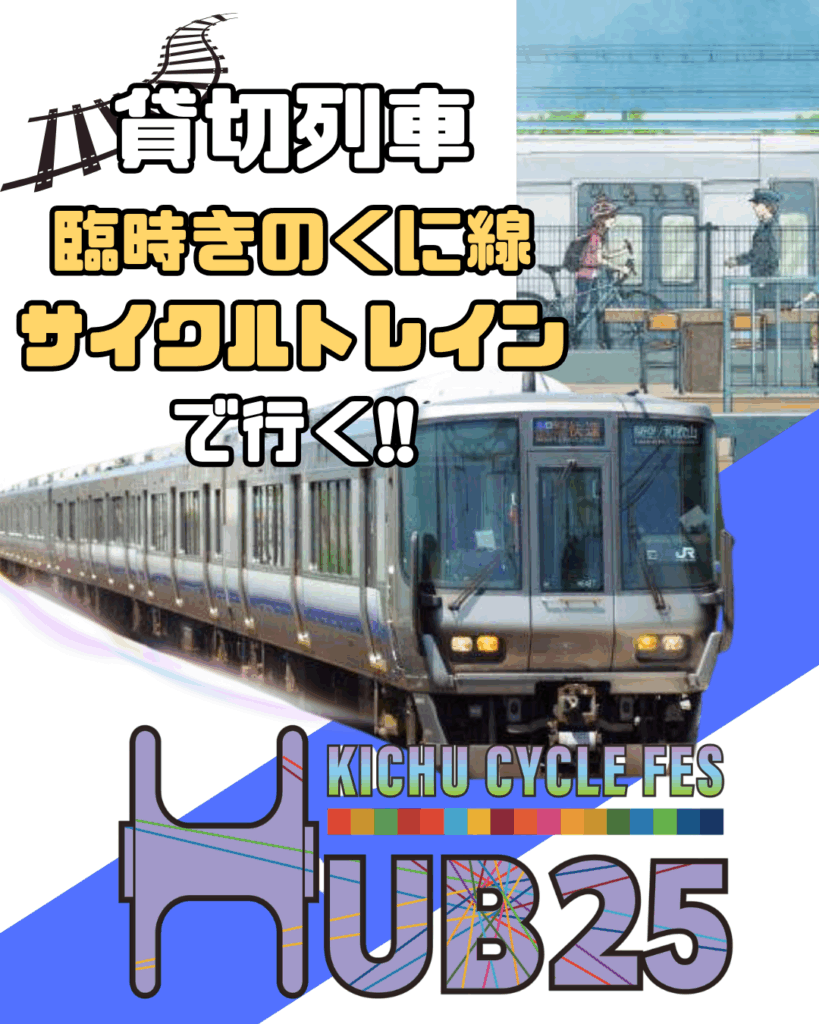 今年のHUB25開催日(2025年11月23日・日)にあわせて、自転車をそのまま車内に持ち込める特別貸切列車「臨時きのくに線サイクルトレイン」の運行が決定いたしました。