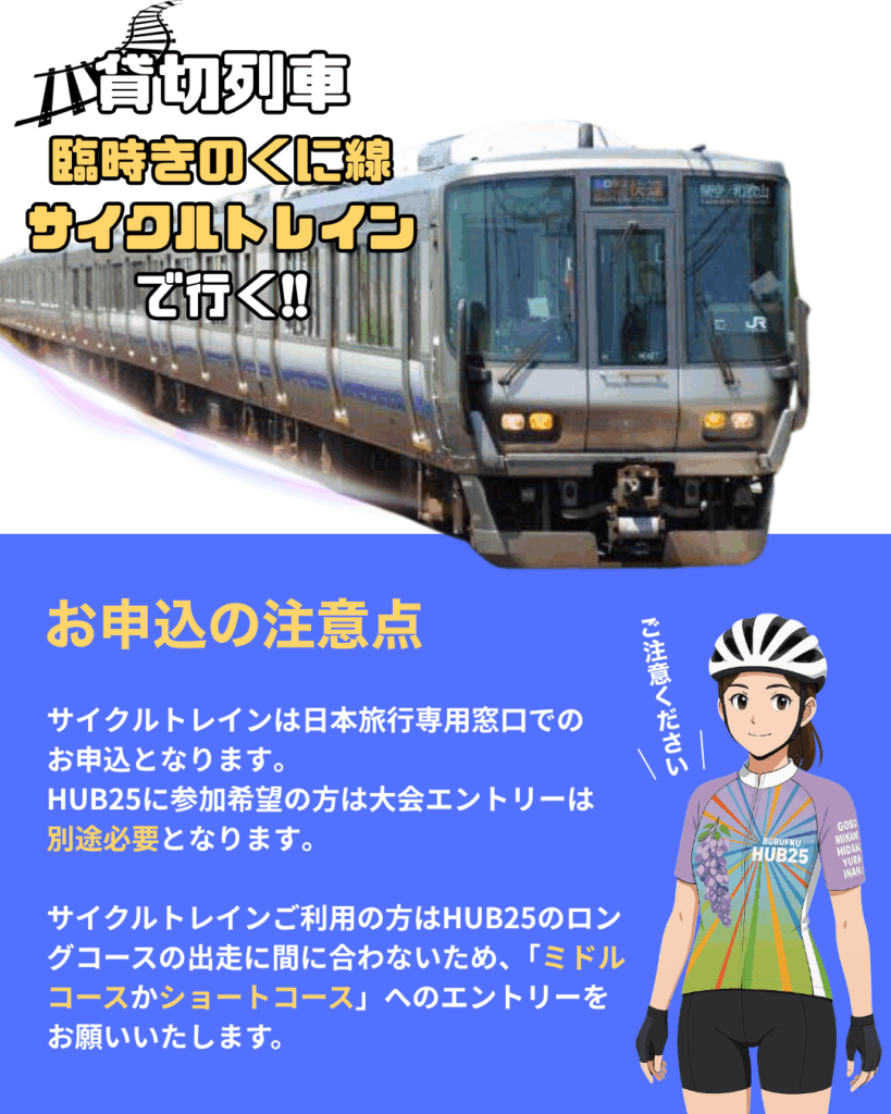 臨時サイクルトレインを利用されてHUB25に参加される方は、ロングコースの出走には間に合わないため、ミドルコース、ショートコースへのエントリーをお願いいたします。