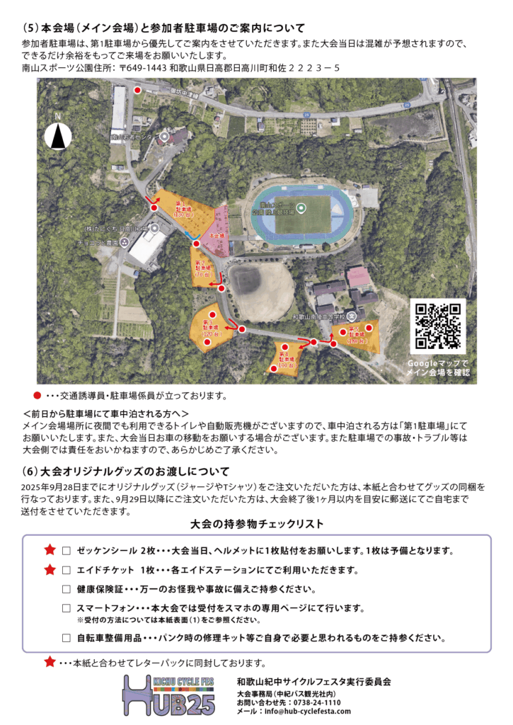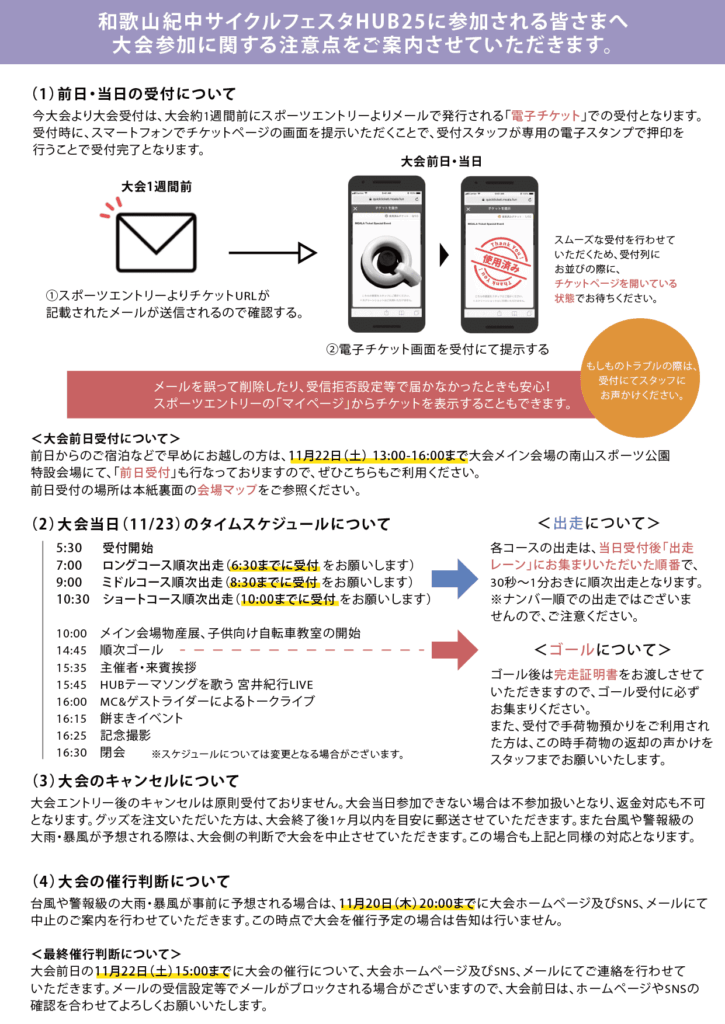 和歌山紀中サイクルフェスタHUB25の開催がいよいよ迫ってきましたが、参加者の皆さまへ大会の注意事項のご案内となります。参加者の皆さまへは、大会開催1週間前を目安に、下記の事前案内書及び必要物品を郵送にてご自宅までお送りさせていただきます。